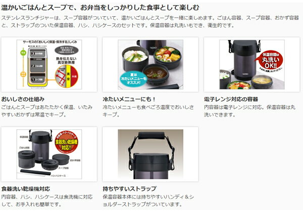 温かいごはんとスープで、お弁当をしっかりした食事として楽しむ ステンレスランチジャーは、スープ容器がついていて、温かいごはんとスープを一緒に楽しめます。