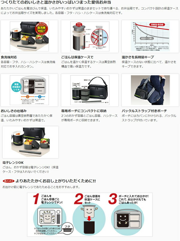 保温効力(6時間) 保温ケースのみの場合:59度以上 保温ケースを専用ポーチに入れた場合:62度以上 ■商品詳細 ■ブランド THERMOS (サーモス) ■商品名 保温弁当箱(約1合) ■品番 DBQ-502 ■カラー MTBK-マットブラック ■素材 ■サイズ 本体寸法/幅×奥行×高さ(約cm):20×11×12.5 ※ 専用ポーチを含みません。