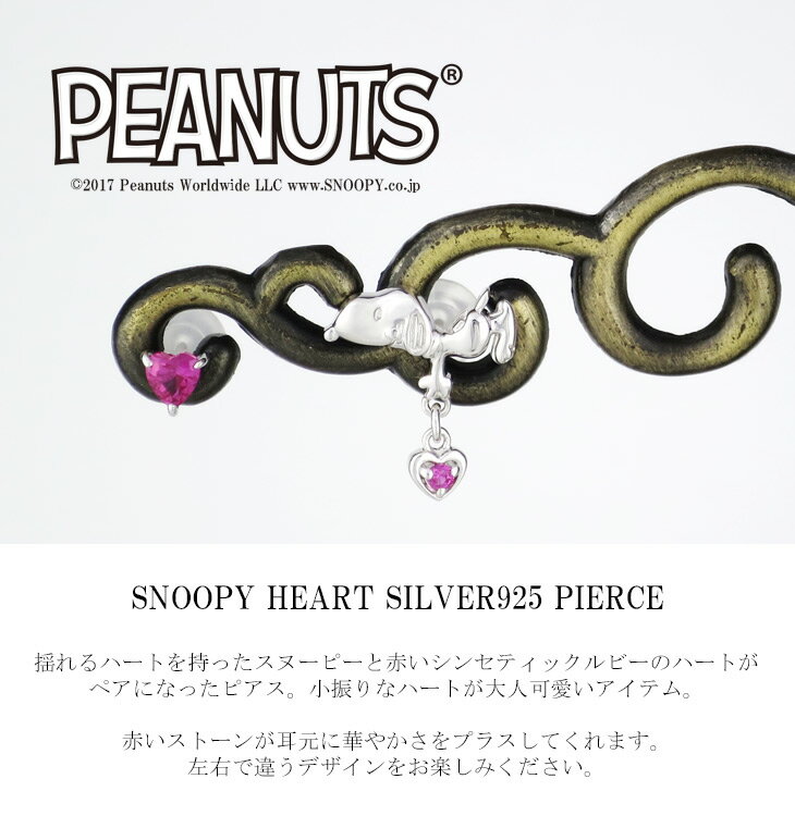 揺れるハートを持ったスヌーピー&赤いシンセティックルビーのハートがペアになったピアス。