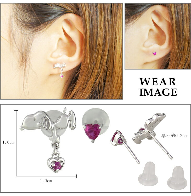 商品データ ・素材 シルバー925(変色防止のロジウム加工)、K10WG(ポスト部分)、シンセティックルビー(合成ルビー) ●スヌーピーモチーフ ・重量(キャッチ含まず) 約0.6g ・大きさ(スヌーピー部分) 縦約0.6cm 横約1.0cm 厚み約0.2cm ●ハートジルコニアモチーフ ・重量(キャッチ含まず) 約0.2g ・大きさ 縦約0.4cm 横約0.4cm 厚み約0.3cm ※モニターにより色の見え方が実際の商品と異なることがございます。