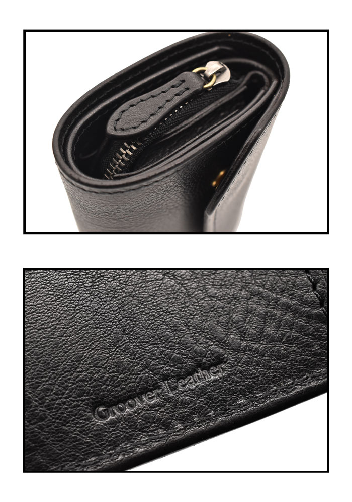 ■商品説明 ■メーカー名: Groover Leather 【グルーバーレザー】 ■品名:三つ折りミニウォレット ■カラー/素材: 外装:ブラック【BLK】/シュリンクレザー・牛革 内装:ブラック【BLK】/シュリンクレザー・牛革 裏貼:ブラック【BLK】/豚革 ■サイズ:H100×W75mm ■ホック:プリムホック ■縫製:ミシン ■収納:マチ付きカードポケット×1、カードポケット×1、小銭入れ×1、札入れ×1 ■店長コメント 手のひらサイズのおしゃれできのう性抜群のコンパクトミニウォレット。