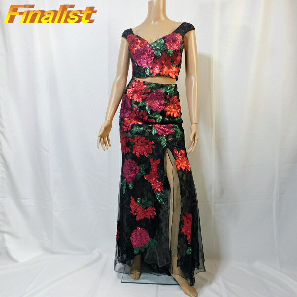 社交ダンス 中古パーティードレス 黒赤の花柄ロング